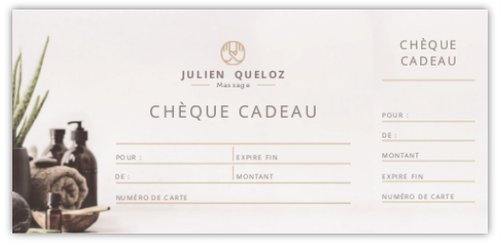 Prêt à faire plaisir? Offrir un bon cadeau de Julien Queloz Massothérapeute est un moyen simple et efficace de montrer votre attention. C'est une invitation à la détente et au ressourcement, pour une expérience inoubliable. Pour commander votre bon cadeau, veuillez m'envoyer un e-mail à massotherpeute@gmail.com ou un message WhatsApp à +41 76 303 92 38 en indiquant le montant souhaité et vos coordonnées complètes. Je vous enverrai le bon à réception du paiement.